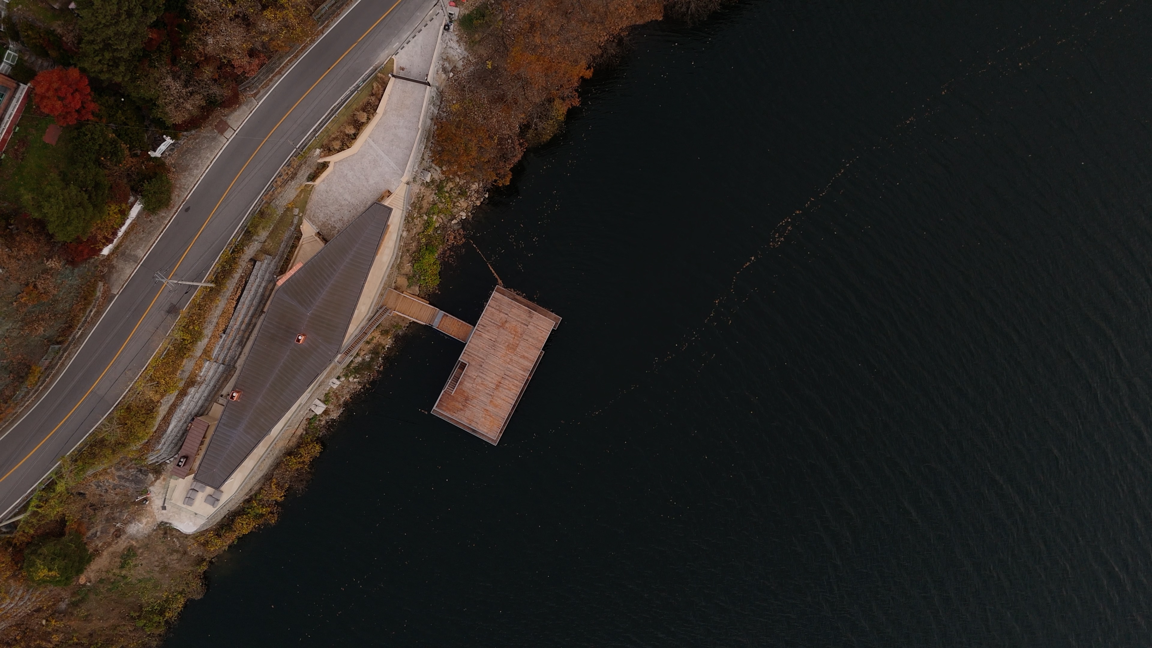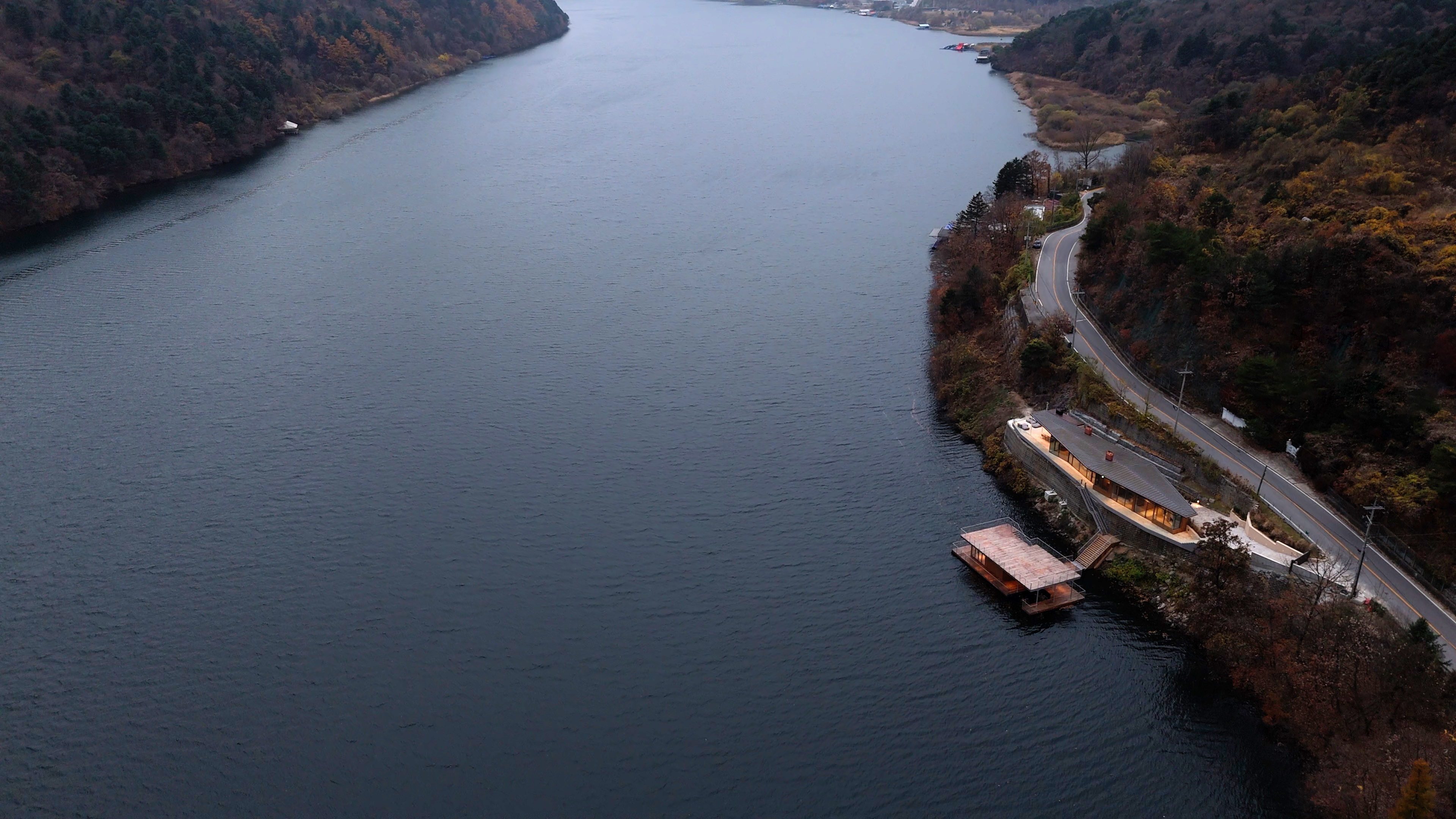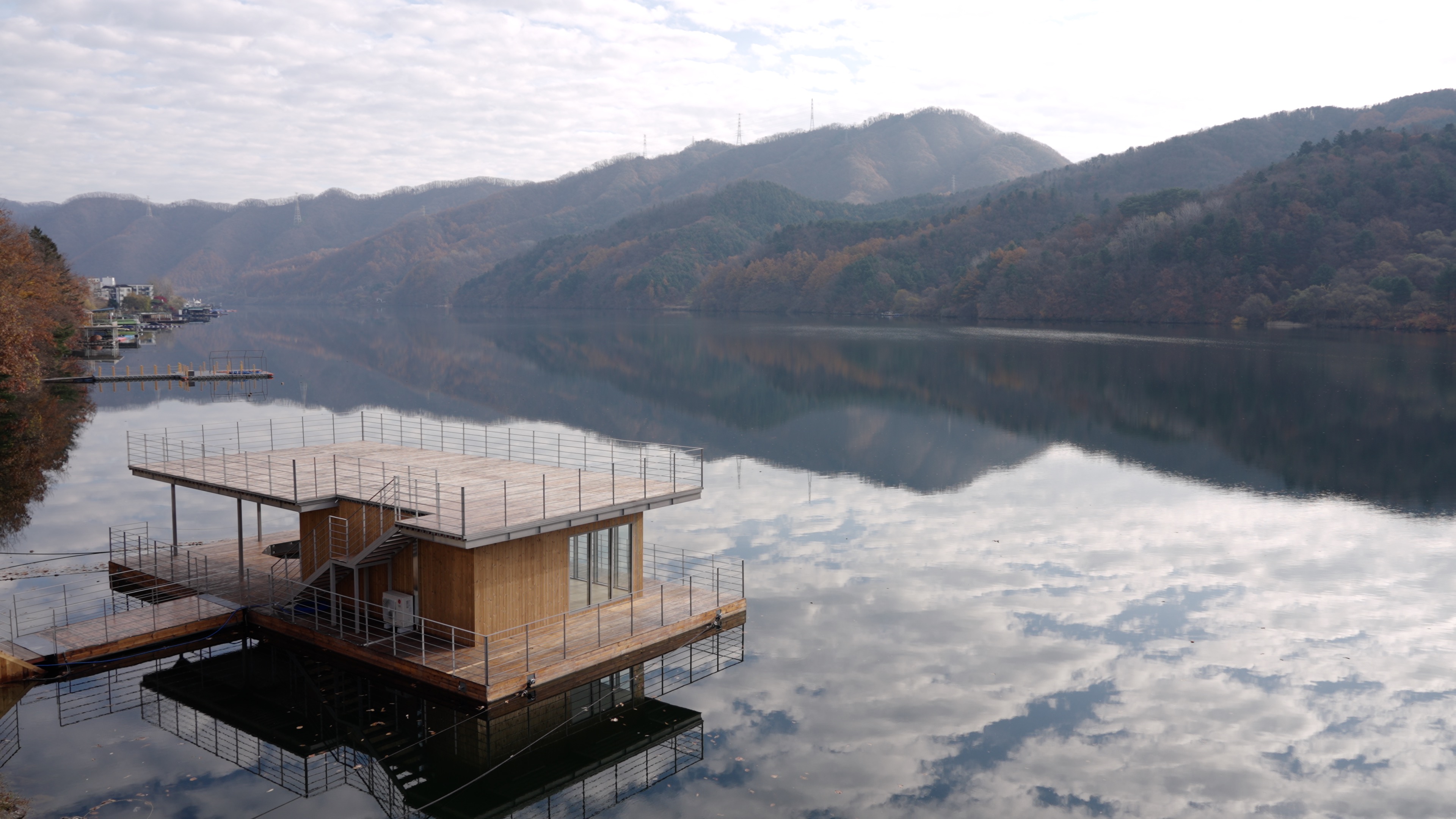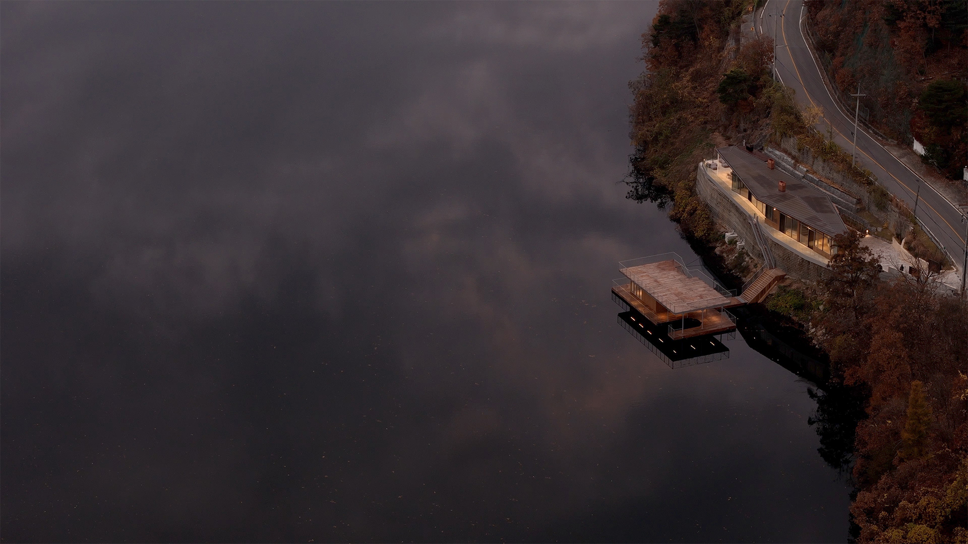 Situated at the edge of the Bukhan River in Geumdae-ri, Gapyeong, this house rests like a quiet line drawn across the scenery, seamlessly blending