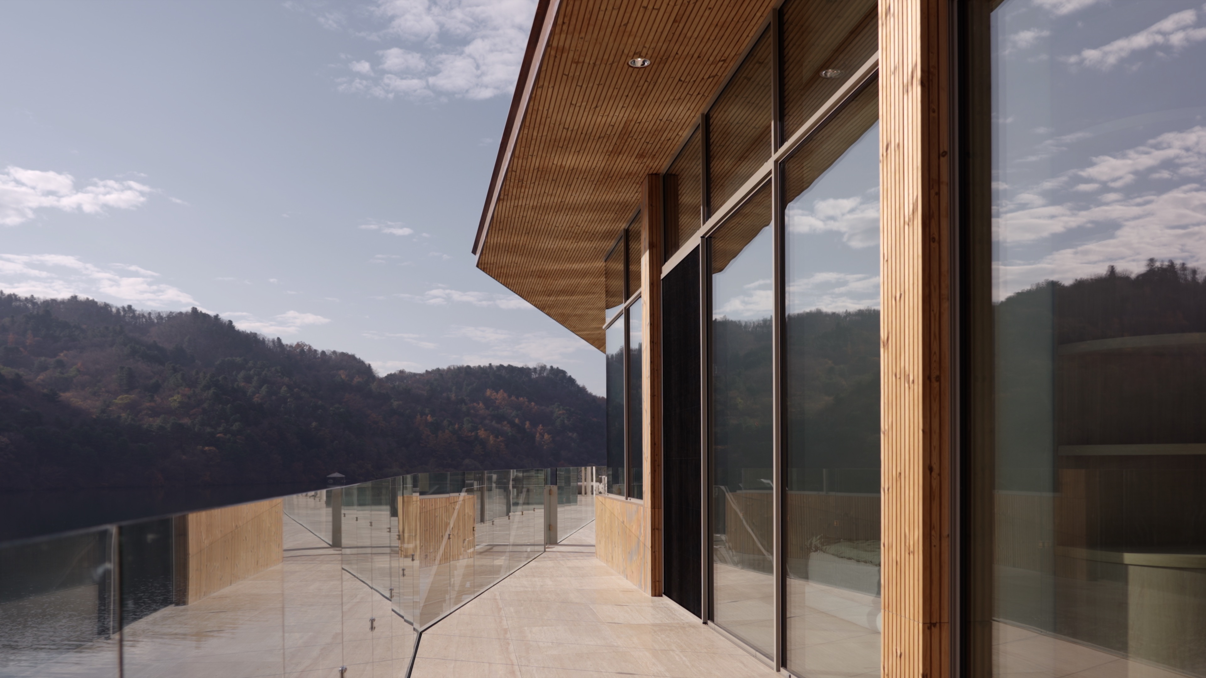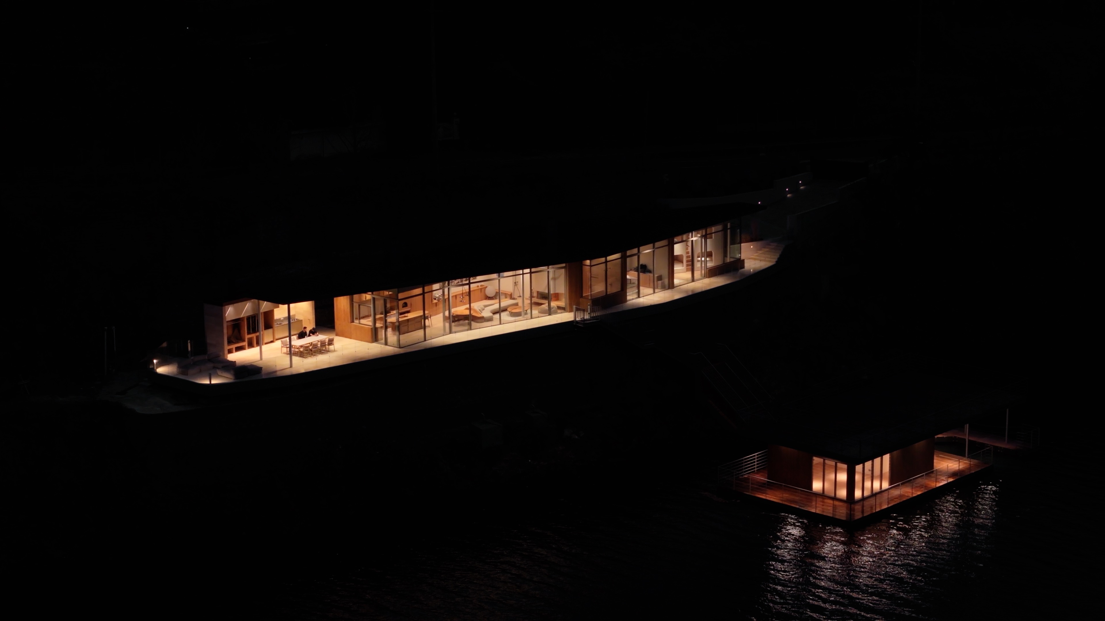 The elongated roof gently follows the river’s curve, dissolving the boundary between architecture and landscape. Through the open glass façade, the mountains and water become part of the interior—a living panorama that the home is in constant dialogue with.
