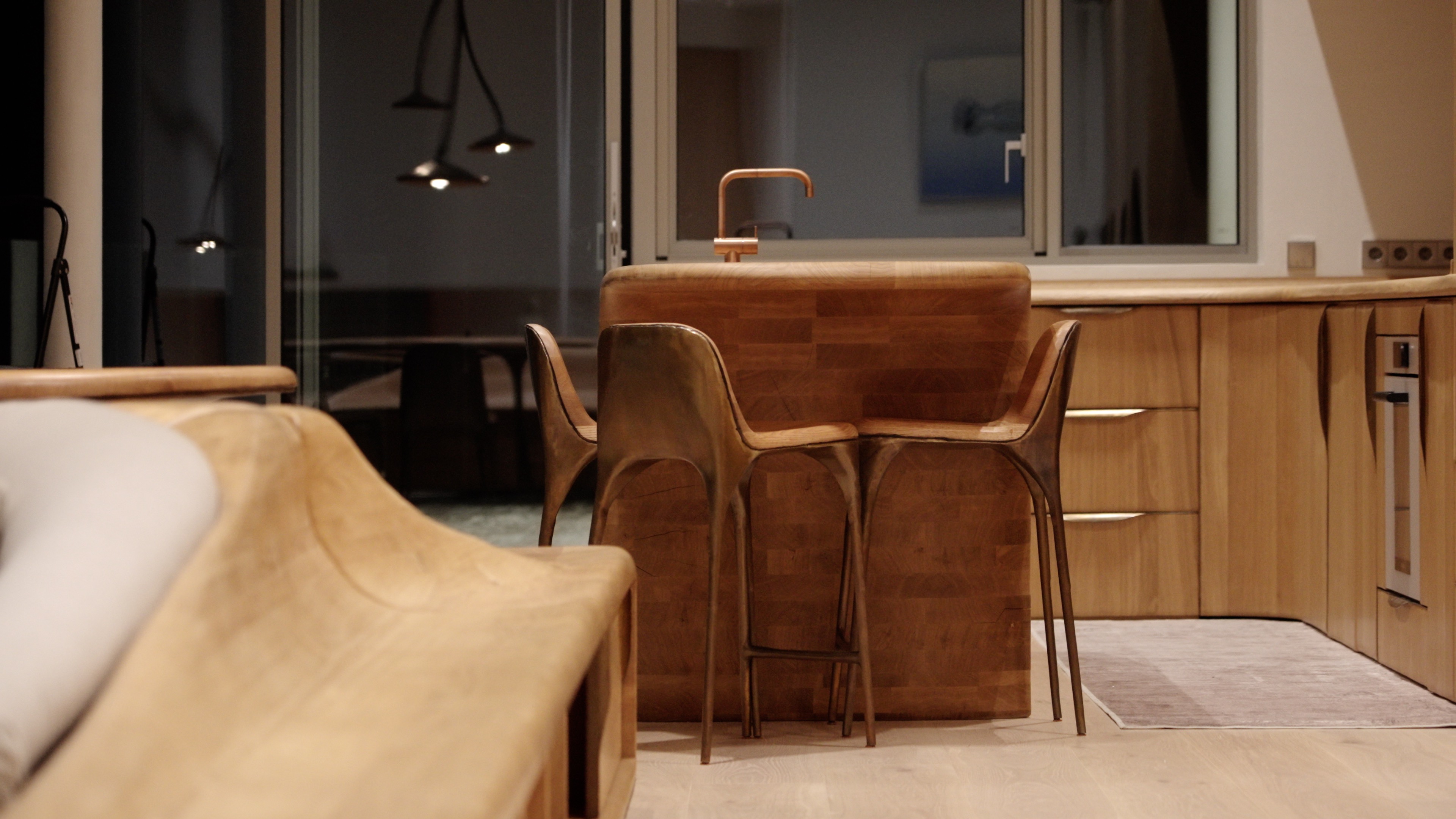 The floating terrace, the flowing curves of the furniture, and the gentle circulation create a tactile connection between the solid presence of nature and the softness of daily life.